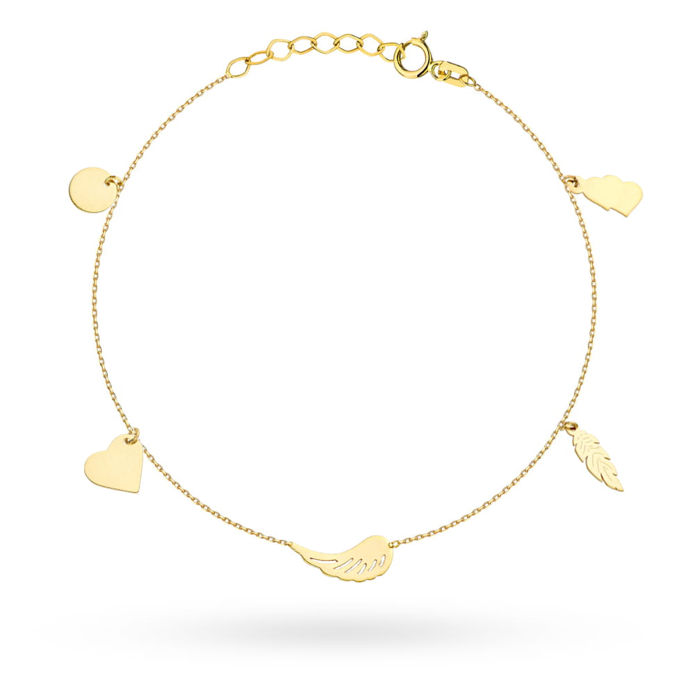 Subtelna i pełna symboliki bransoletka złota próby 585 z zestawem urokliwych zawieszek: dwa serca (6 × 4 mm), piórko (8 × 2 mm), skrzydełko (10 × 4 mm), dodatkowe serce (4 × 6 mm) oraz kółko o średnicy 6 mm. Wykonana z żółtego złota w pełnej konstrukcji, zapewnia trwałość przy zachowaniu delikatnego wyglądu. Dzięki regulowanej długości 17 + 2 cm, dopasowuje się do każdego nadgarstka. Bransoletka bez kamieni, idealna na co dzień i na prezent – niesie przesłanie miłości, wolności i ochrony.