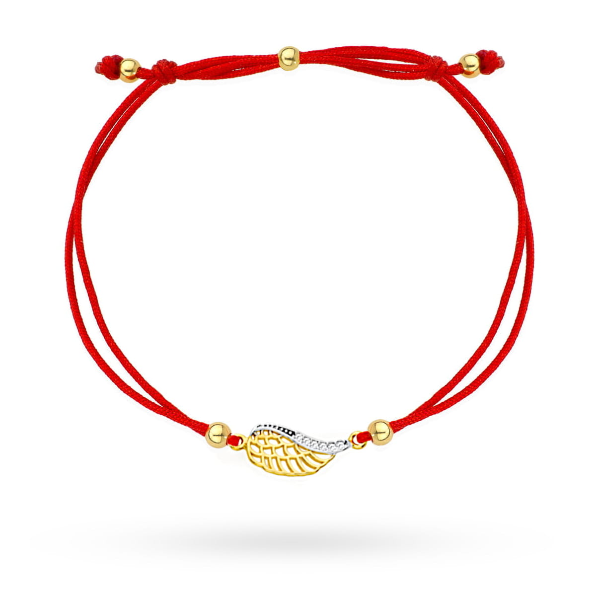 Bransoletka złota skrzydełko z cyrkoniami na czerwonym sznurku. Wykonana z żółtego złota próby 585, ozdobiona motywem skrzydełka o wymiarach 13 x 7 mm, pokrytym błyszczącymi cyrkoniami. Umieszczona na czerwonym sznurku z regulacją długości od 14 do 20 cm, dopasowuje się do każdego nadgarstka. Symbol ochrony i lekkości – idealna jako prezent z przesłaniem.