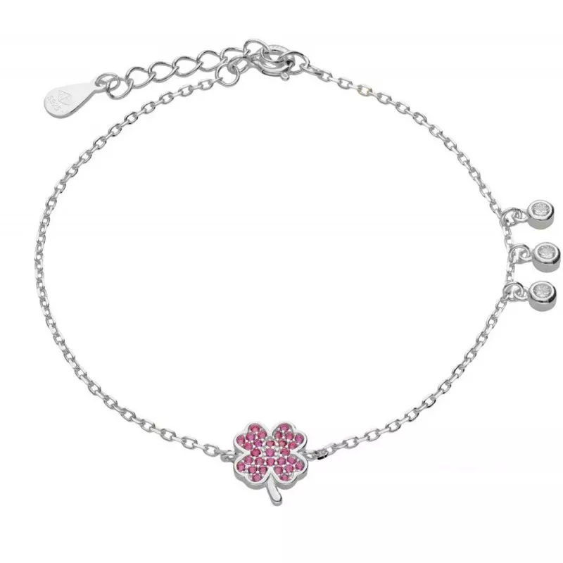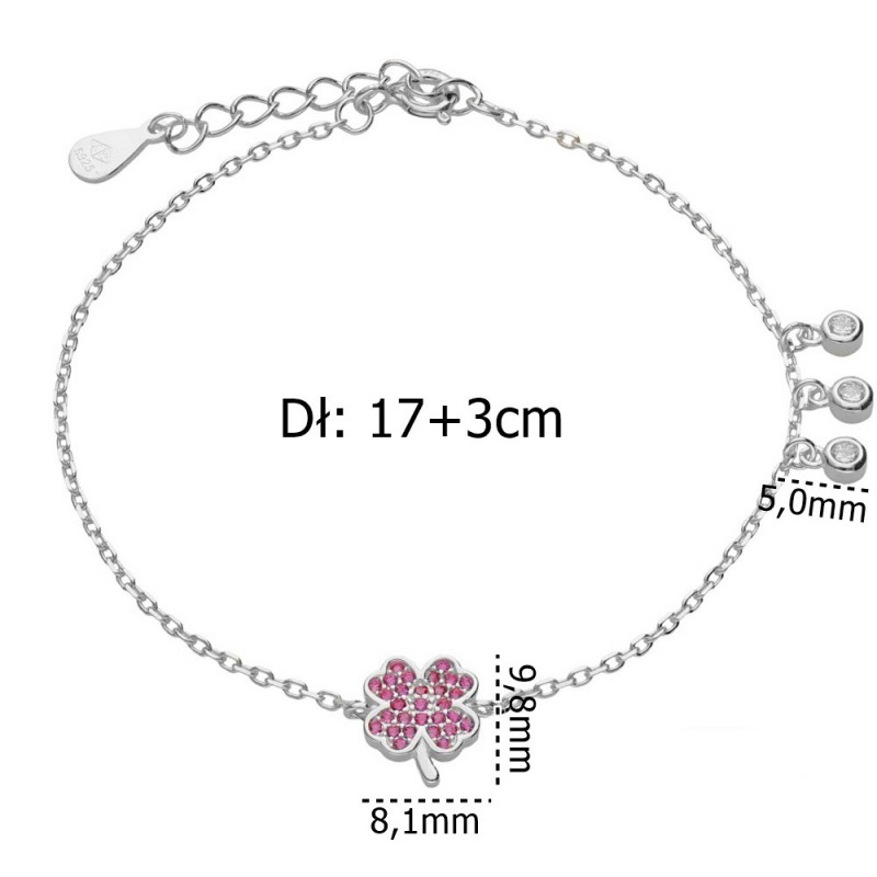 Bransoletka srebrna 925 z różową koniczynką i cyrkoniami – rodowana, regulowana