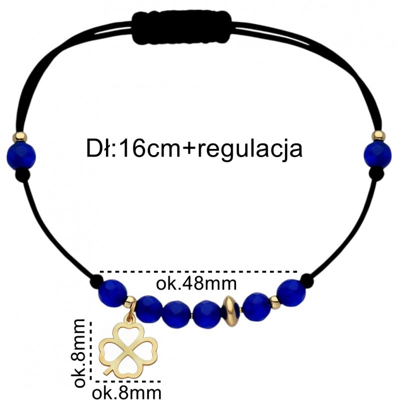 Bransoletka sznurkowa z pozłacanym srebrem koniczynką i niebieskimi agatami