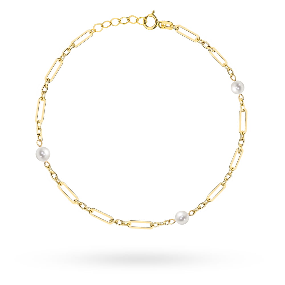 Bransoletka została wykonana z żółtego złota próby 585, które gwarantuje trwałość oraz estetyczny, szlachetny wygląd. Długie, owalne ogniwa o długości około 7,00 mm i szerokości około 2,20 mm nadają całości lekkości i nowoczesnego charakteru. Naturalne perły słodkowodne o średnicy 4 mm wprowadzają klasyczny akcent, subtelnie przełamując złotą formę.