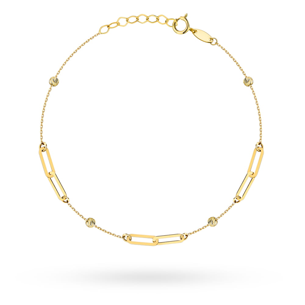 Złota bransoletka z eleganckimi podwójnymi ogniwami i błyszczącymi diamentowanymi kulkami. Wykonana ze złota próby 585 w kolorze żółtym, ma długość 17+2 cm z możliwością regulacji. Ogniwa mierzą ok. 2,7 x 7,9 mm, a średnica kulek to ok. 2,5 mm. Subtelna i stylowa biżuteria, idealna do codziennych i eleganckich stylizacji.