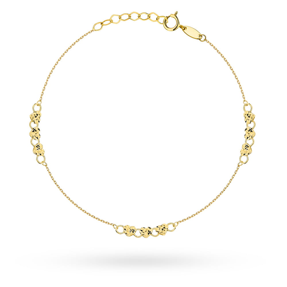 Złota bransoletka 585 z diamentowanymi i gładkimi serduszkami to subtelny wyraz uczuć zamknięty w eleganckiej formie. Symbol serca od wieków kojarzony jest z miłością, bliskością i emocjonalnym ciepłem – dlatego ta biżuteria świetnie sprawdzi się jako prezent dla ukochanej osoby lub wyjątkowy dodatek na ważną okazję. Serduszka o wymiarach ok. 4,30 × 3,60 mm, wykonane naprzemiennie w wersji diamentowanej i gładkiej, odbijają światło i dodają całości subtelnego blasku. Regulowana długość 17 + 2 cm umożliwia idealne dopasowanie do nadgarstka.