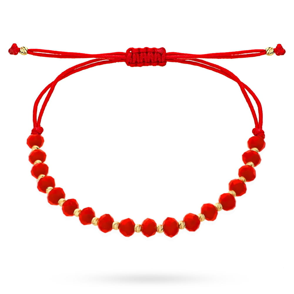 Złota bransoletka na czerwonym sznurku z diamentowanymi kulkami i czerwonymi kamieniami to połączenie subtelnej elegancji i symbolicznego znaczenia.