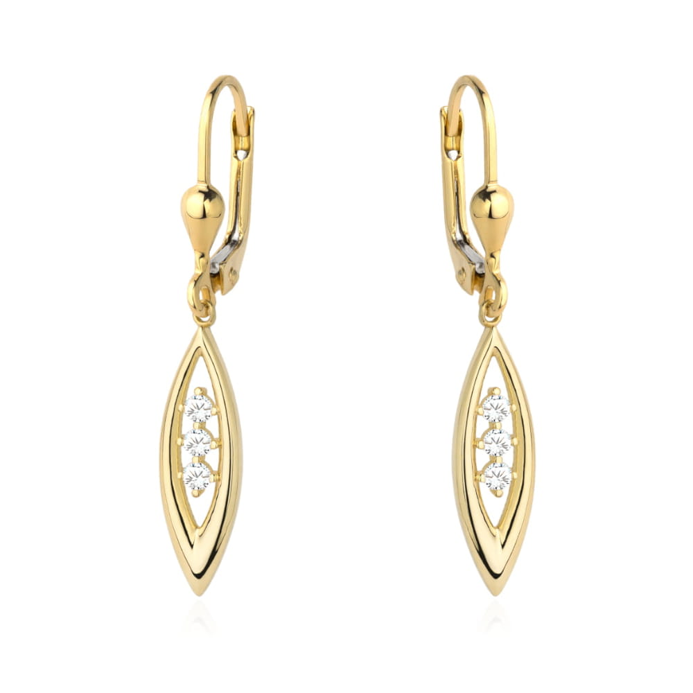Kolczyki złote łezka i trzy cyrkonie to elegancka biżuteria, która podkreśla kobiecą delikatność. Wykonano je z żółtego złota próby 585, które łączy blask i trwałość. Smukła łezka o wymiarach 20 × 2–6 mm stanowi centralny element, a jej subtelną linię zdobią trzy błyszczące cyrkonie o średnicy 2 mm. Całkowita długość kolczyków to 35 mm, dzięki czemu prezentują się efektownie i smukło. Angielskie zapięcie zapewnia wygodę i bezpieczeństwo noszenia. To idealny wybór na eleganckie okazje i piękny prezent.