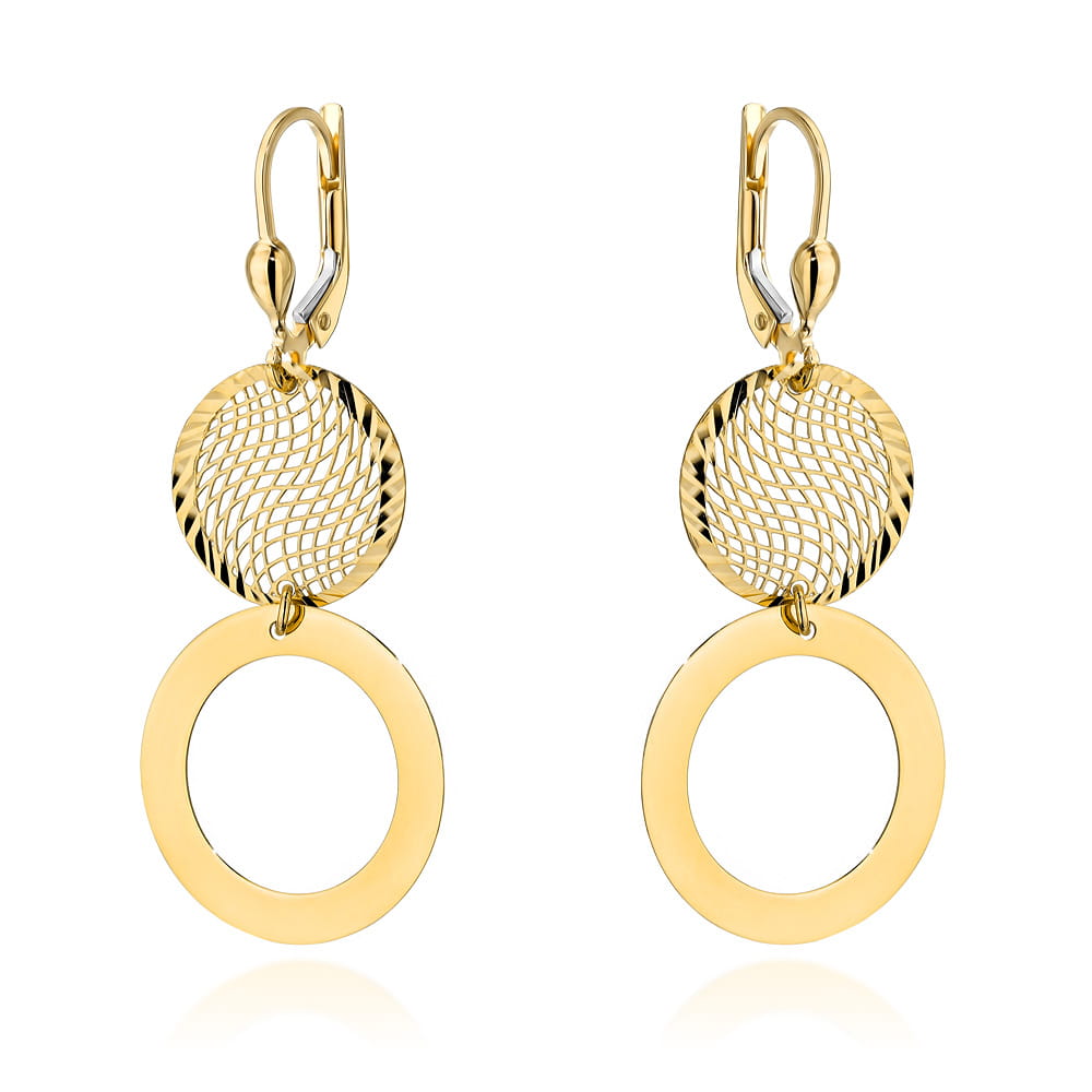Kolczyki złote ażurowe koło i ring na angielskim zapięciu to efektowna biżuteria o nowoczesnym charakterze. Wykonano je z żółtego złota próby 585, które wyróżnia się trwałością i eleganckim blaskiem. Wiszące koło ażurowe o średnicy 15 mm subtelnie łączy się z ringiem o średnicy 20 mm, tworząc wyjątkową kompozycję. Całkowita długość kolczyków wynosi 48 mm, z czego sam element dekoracyjny mierzy 35 mm. Angielskie zapięcie zapewnia wygodę i bezpieczeństwo noszenia. To idealny wybór dla kobiet ceniących lekkie, ale efektowne dodatki.