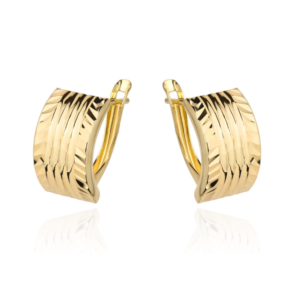 Postaw na ponadczasową elegancję z nowoczesnym wykończeniem dzięki złotym kolczykom diamentowanym, które pięknie odbijają światło i przyciągają spojrzenia. Wykonane z wysokiej jakości żółtego złota próby 585, zachwycają lekką formą i wygodnym angielskim zapięciem, które zapewnia bezpieczeństwo i komfort noszenia. Idealne jako codzienna biżuteria z klasą lub gustowny prezent.