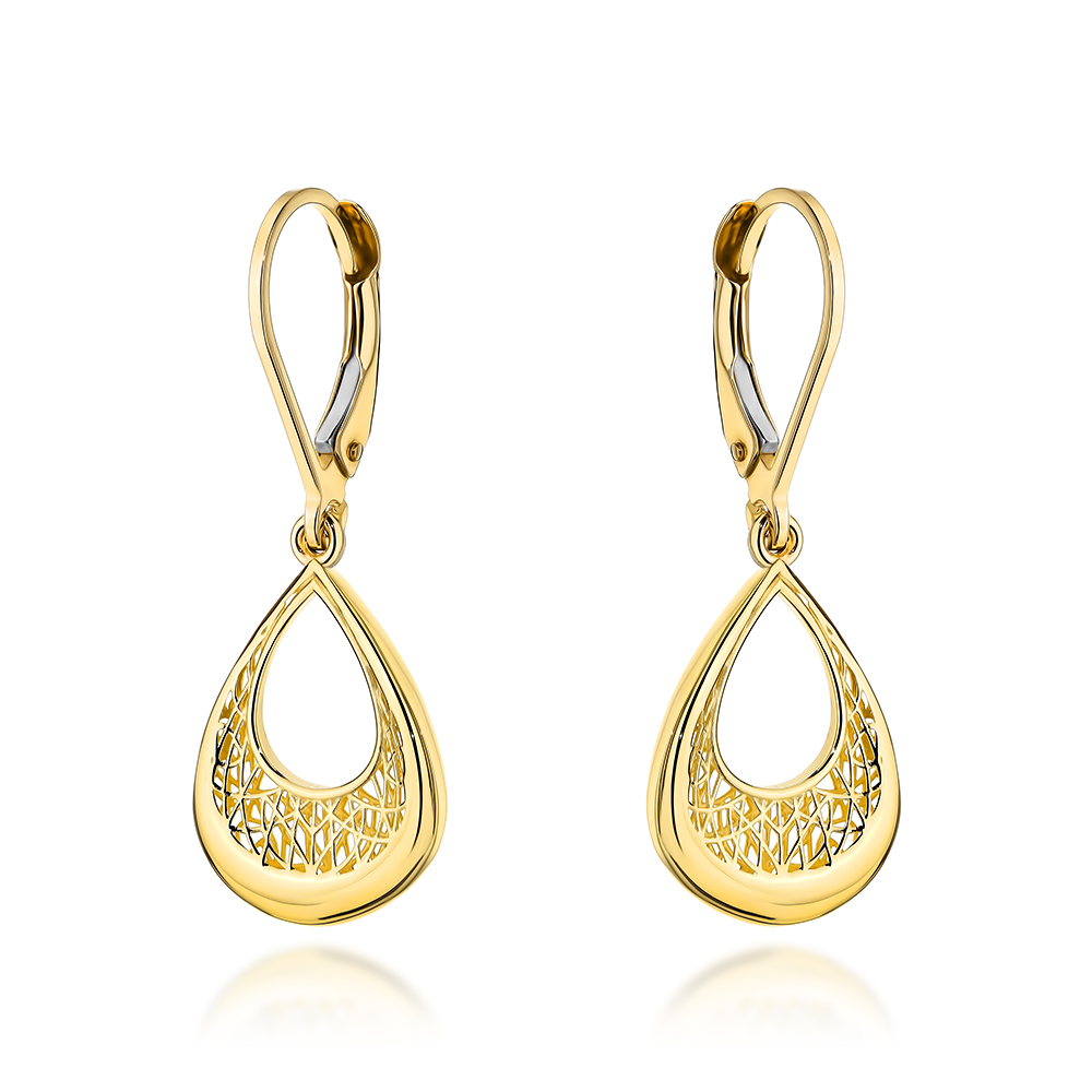 Te wyjątkowe złote kolczyki w kształcie łezek zachwycają subtelną formą oraz efektownym ażurowym zdobieniem, które nadaje im lekkości i finezji.