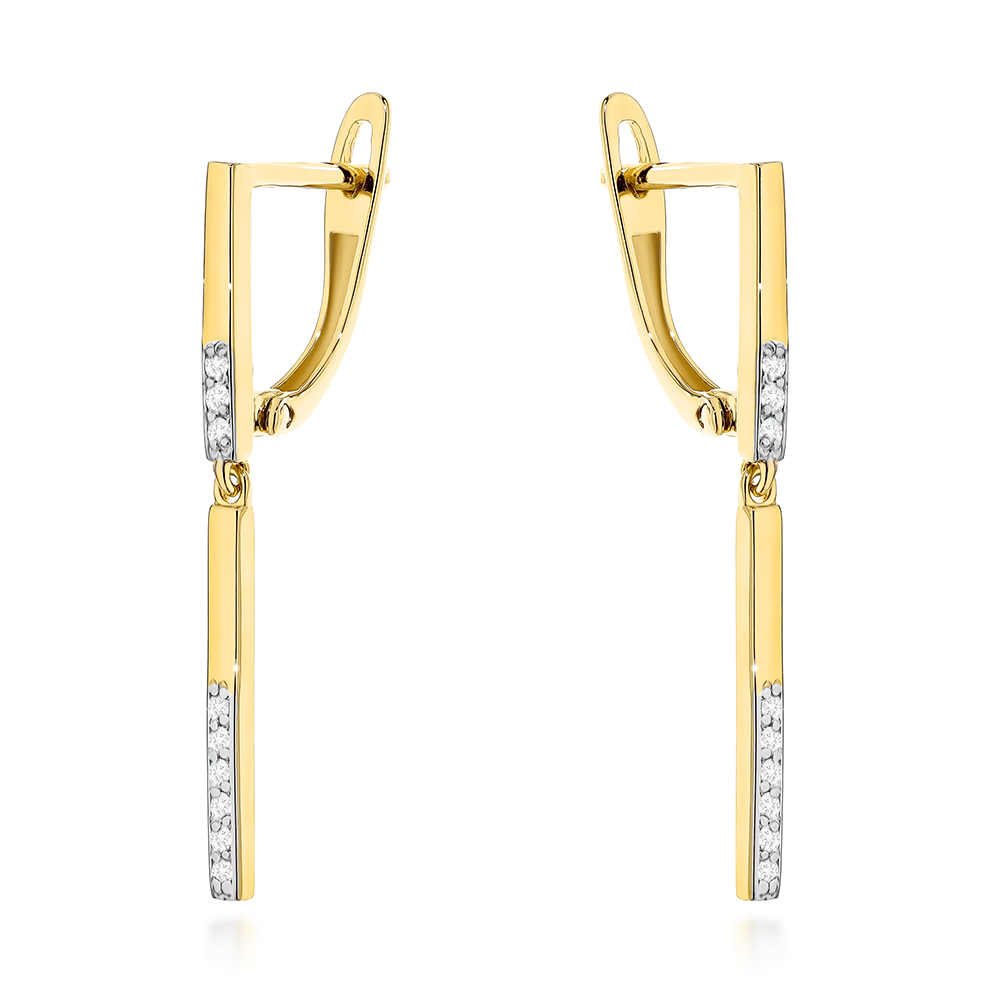Złote kolczyki w formie eleganckiego pręcika zdobionego cyrkoniami, osadzone na wygodnym angielskim zapięciu. Wykonane ze złota próby 585 w kolorze żółtym, mają długość ok. 27,75 mm i szerokość ok. 1,6 mm. Subtelna i stylowa biżuteria, która doda blasku każdej stylizacji.