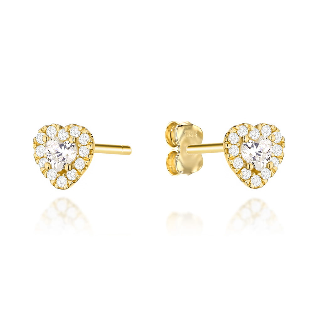 Złote kolczyki w kształcie serduszek wysadzanych błyszczącymi cyrkoniami. Romantyczna i elegancka biżuteria, idealna na prezent i wyjątkowe okazje.