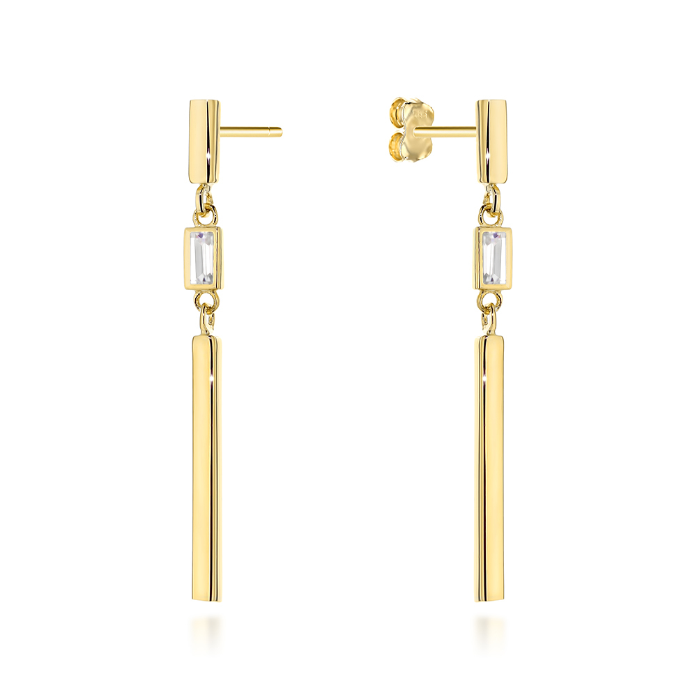 Model wyróżnia się minimalistycznym kształtem smukłych pałeczek, które subtelnie wydłużają szyję i pięknie układają się przy twarzy. W dolnej części kolczyków osadzono lśniące białe cyrkonie o wymiarach ok. 3,75 x 2,30 mm w formie prostokąta. Kamień podkreśla elegancję biżuterii i dodaje jej świetlistości.