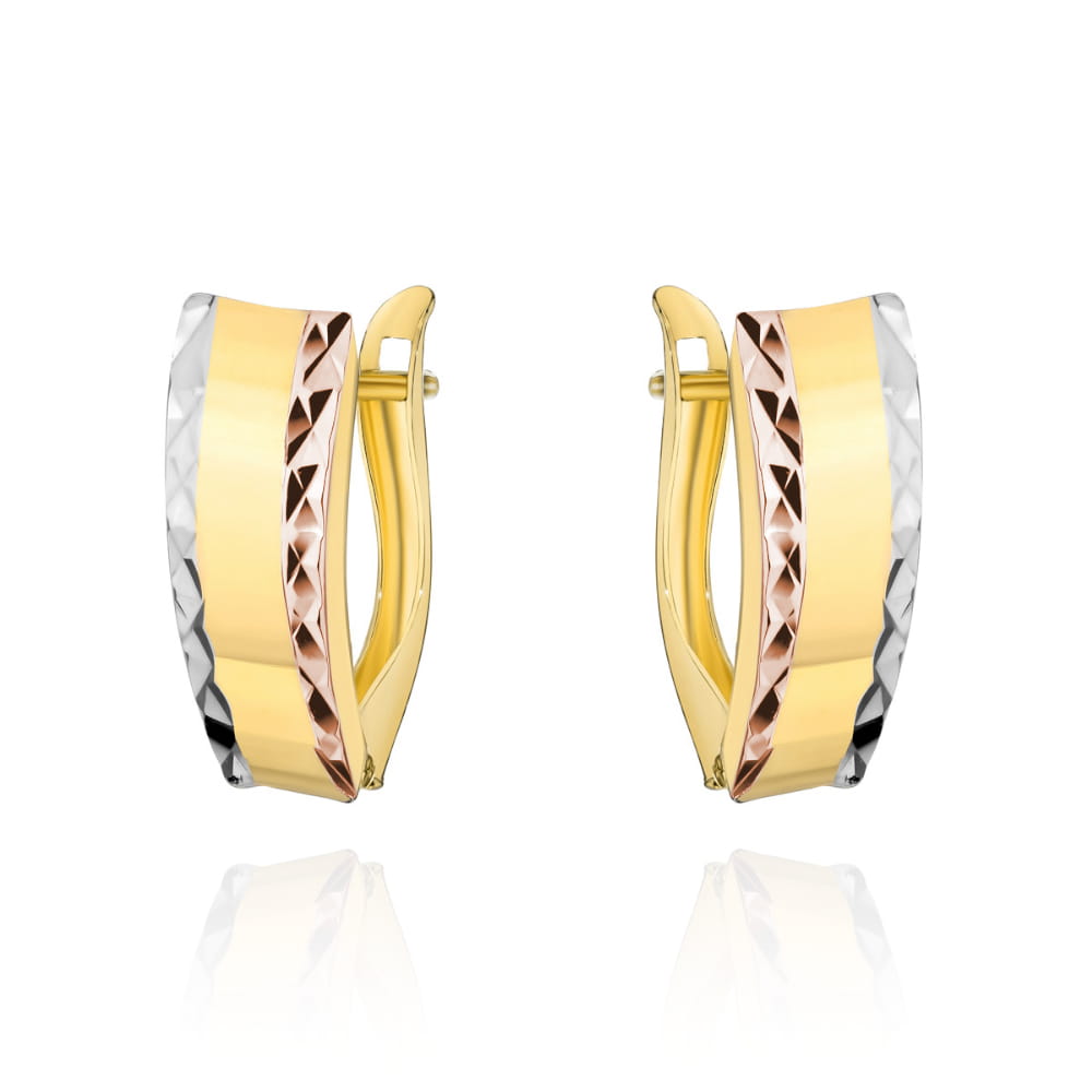 Złote kolczyki prostokątne z diamentowanymi brzegami w trzech kolorach złota próby 585. Nowoczesna elegancja i klasyczny styl.