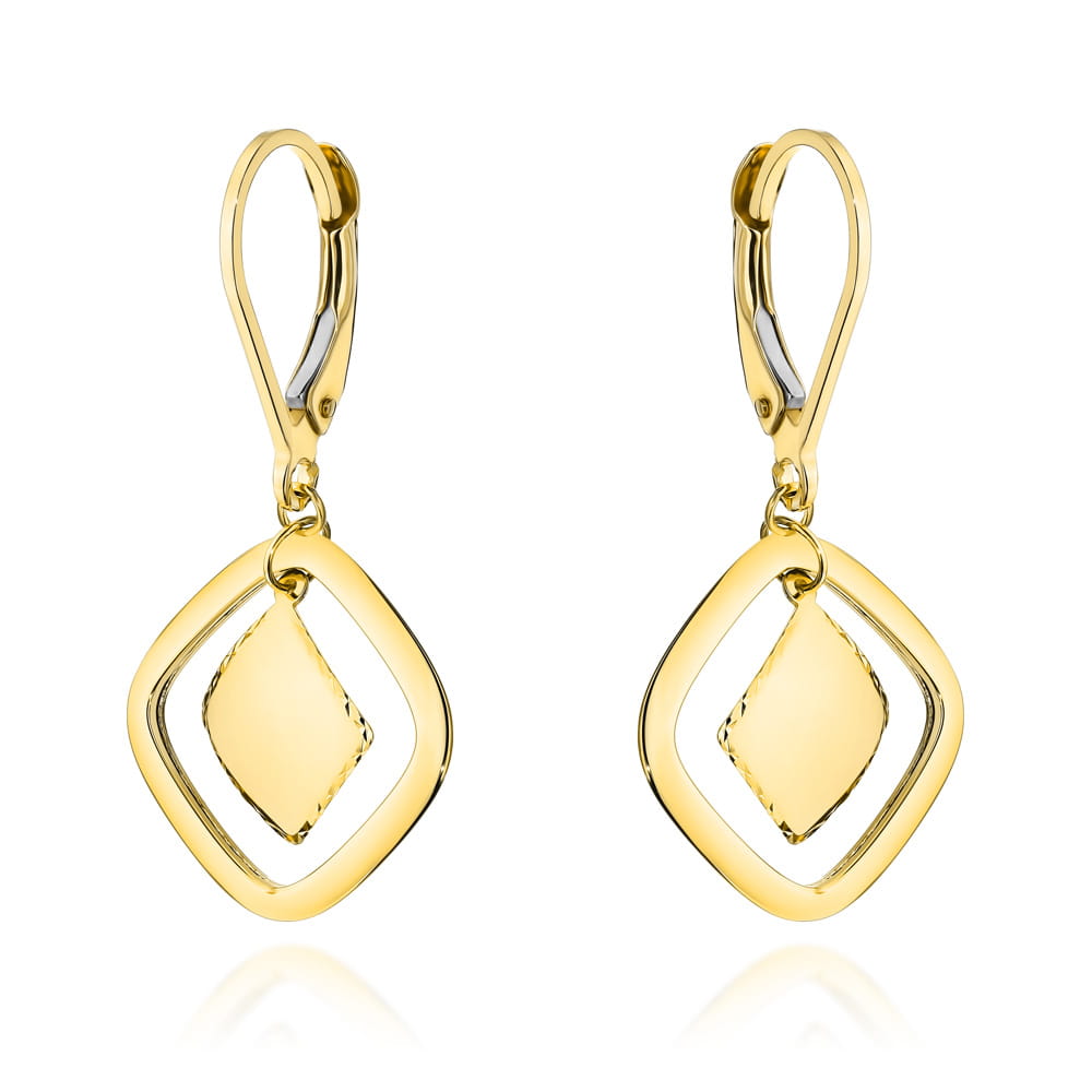 Złote kolczyki z wiszącymi rombami na angielskim zapięciu to elegancka biżuteria o nowoczesnym charakterze. Wykonane z żółtego złota próby 585, zachwycają geometrycznym wzorem rombu i delikatnym ruchem przy noszeniu. Angielskie zapięcie zapewnia wygodę i bezpieczeństwo użytkowania.