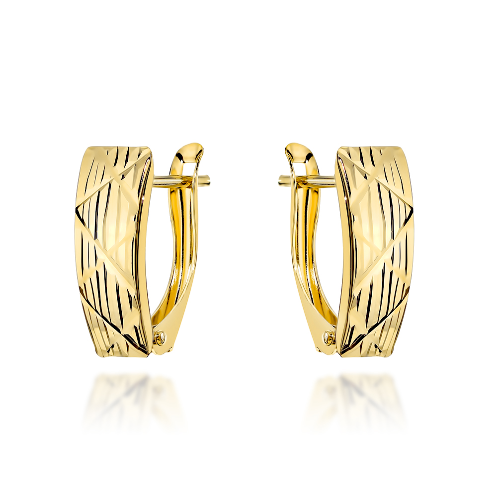 Eleganckie kolczyki złote 585 zdobione diamentowanymi paskami to idealny wybór dla osób ceniących wyrafinowaną, klasyczną biżuterię z delikatnym akcentem nowoczesności. Wykonane z żółtego złota próby 585, zachwycają subtelnym blaskiem oraz precyzyjnym, poprzecznym diamentowaniem, które tworzy efektowną grę światła przy każdym ruchu.