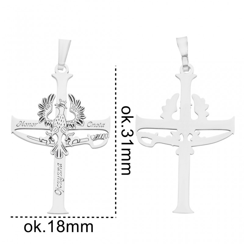 Napis „Honor Cnota Ojczyzna” nawiązuje do tradycyjnych wartości, które od pokoleń zajmują ważne miejsce w historii i tożsamości. Motyw krzyża w połączeniu z czytelnym napisem tworzy spójną i wyrazistą formę, natomiast klasyczne wykończenie sprawia, że biżuteria pozostaje ponadczasowa.