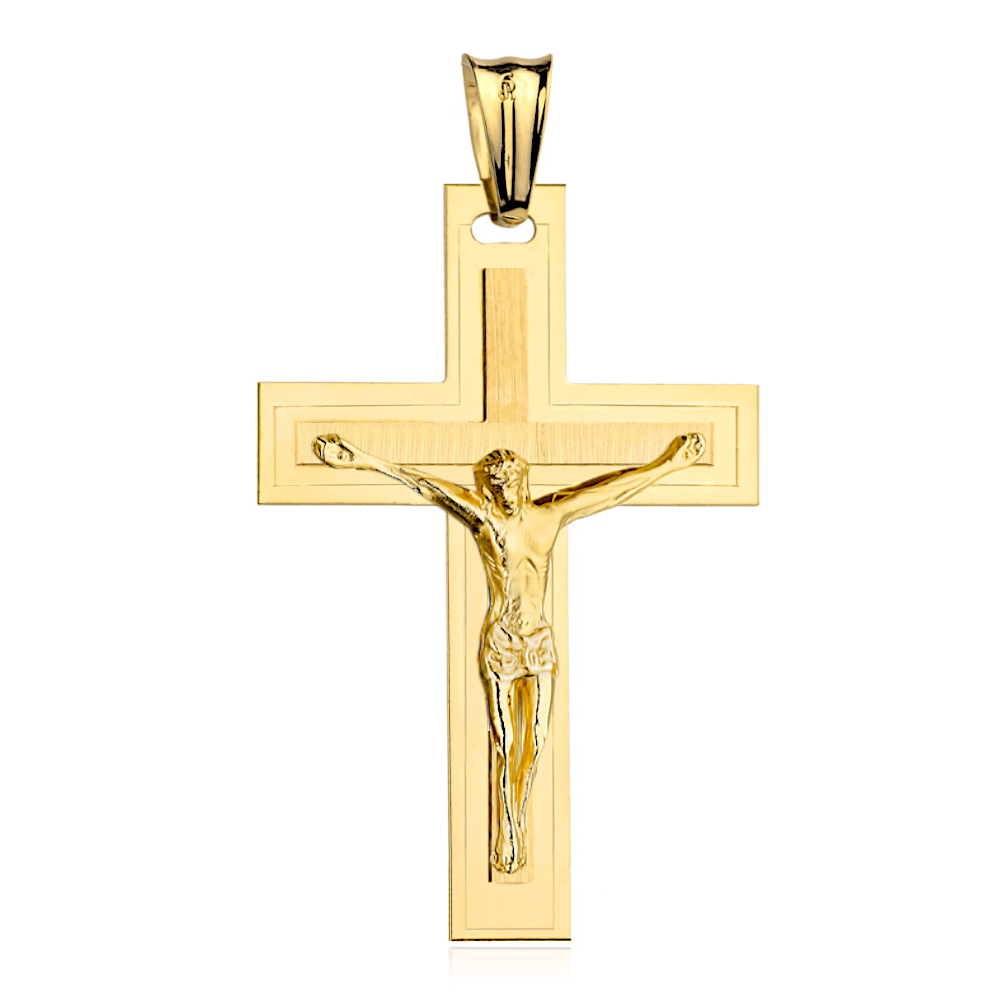 Krzyżyk został wykonany z wysokiej jakości żółtego złota próby 585, co zapewnia trwałość oraz ciepły, klasyczny odcień. Satynowana powierzchnia kontrastuje z gładkimi elementami, uwydatniając wizerunek Jezusa i nadając całości głębi oraz elegancji. Brak kamieni pozwala skupić uwagę na formie i religijnym przesłaniu.