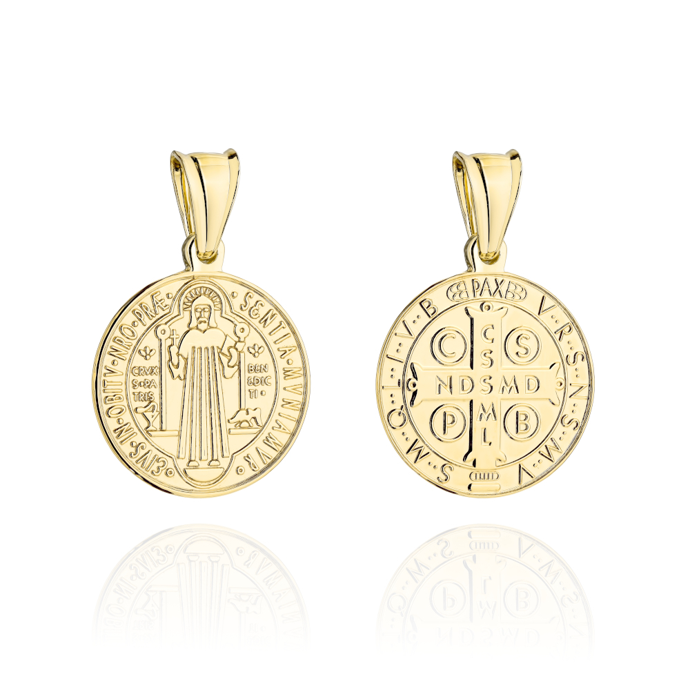 Medalik złoty dwustronny św. Benedykt średni z żółtego złota próby 585. Średnica 16,60 mm i klasyczny symbol ochrony.