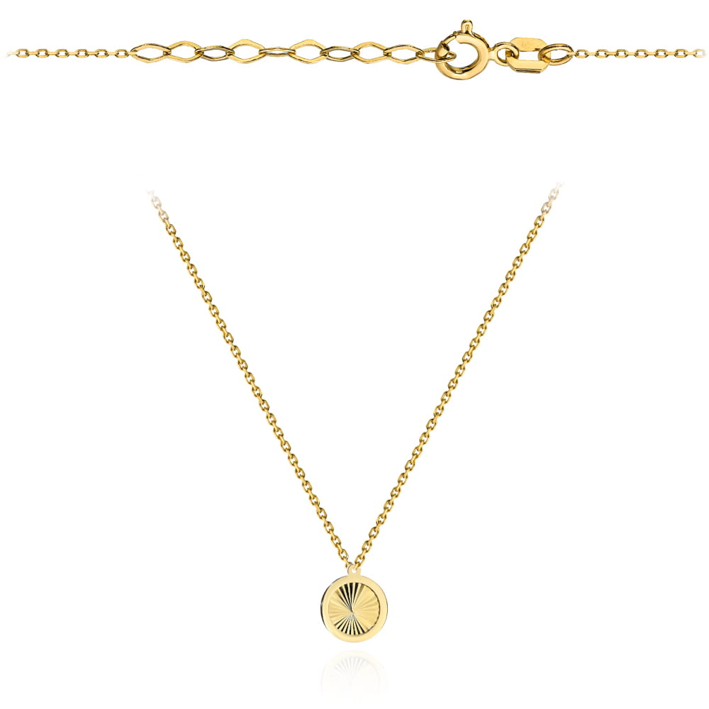 Subtelny i elegancki złoty naszyjnik z diamentowanym kółeczkiem w gładkiej oprawie. Wykonany z żółtego złota próby 585, zachwyca prostotą i blaskiem. Dzięki super lekkiej konstrukcji oraz długości z regulacją (43 + 2 cm) świetnie dopasowuje się do szyi i sprawdzi się zarówno na co dzień, jak i na wyjątkowe okazje.