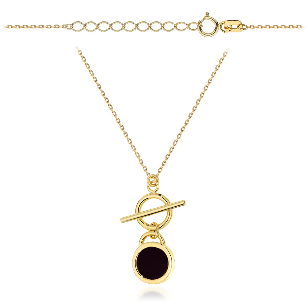 Stylowy i minimalistyczny naszyjnik ze złota próby 585, ozdobiony kółeczkiem z czarnym kamieniem. Wykonany z żółtego złota, zachwyca nowoczesną formą i subtelnym błyskiem. Dzięki regulowanej długości 42+3 cm, doskonale układa się na dekolcie i sprawdzi się jako delikatny dodatek na co dzień lub elegancki akcent wieczorowy.