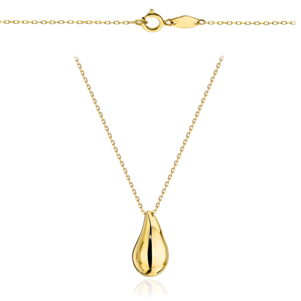 Centralnym elementem naszyjnika jest zawieszka w kształcie kropli o wymiarach 21 × 12 mm – większa, wyrazista forma przyciąga uwagę, a jednocześnie pozostaje subtelna i kobieca. Naszyjnik nie zawiera kamieni, dzięki czemu jego elegancja opiera się wyłącznie na szlachetnym blasku złota. Łańcuszek o długości 45 cm delikatnie układa się na dekolcie, dodając lekkości całej stylizacji.