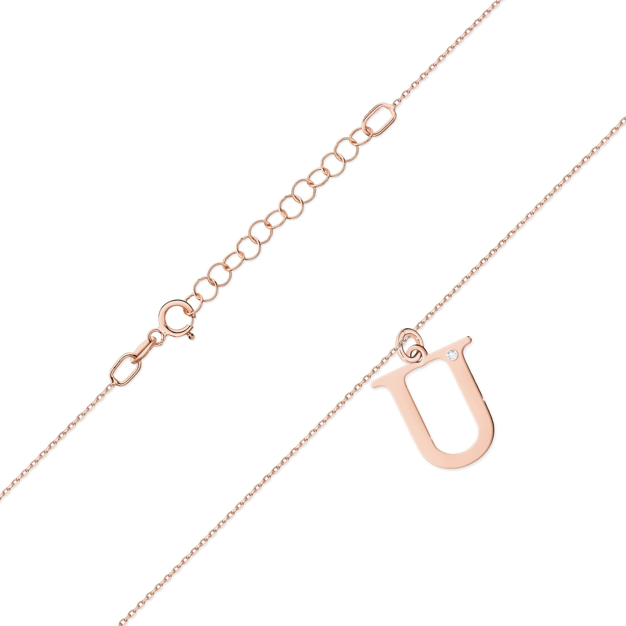 W centrum literki lśni drobny diament o masie 0,005 ct, średnicy 1,0 mm i czystości SI2 H. Kamień subtelnie mieni się w świetle, podkreślając elegancję naszyjnika.