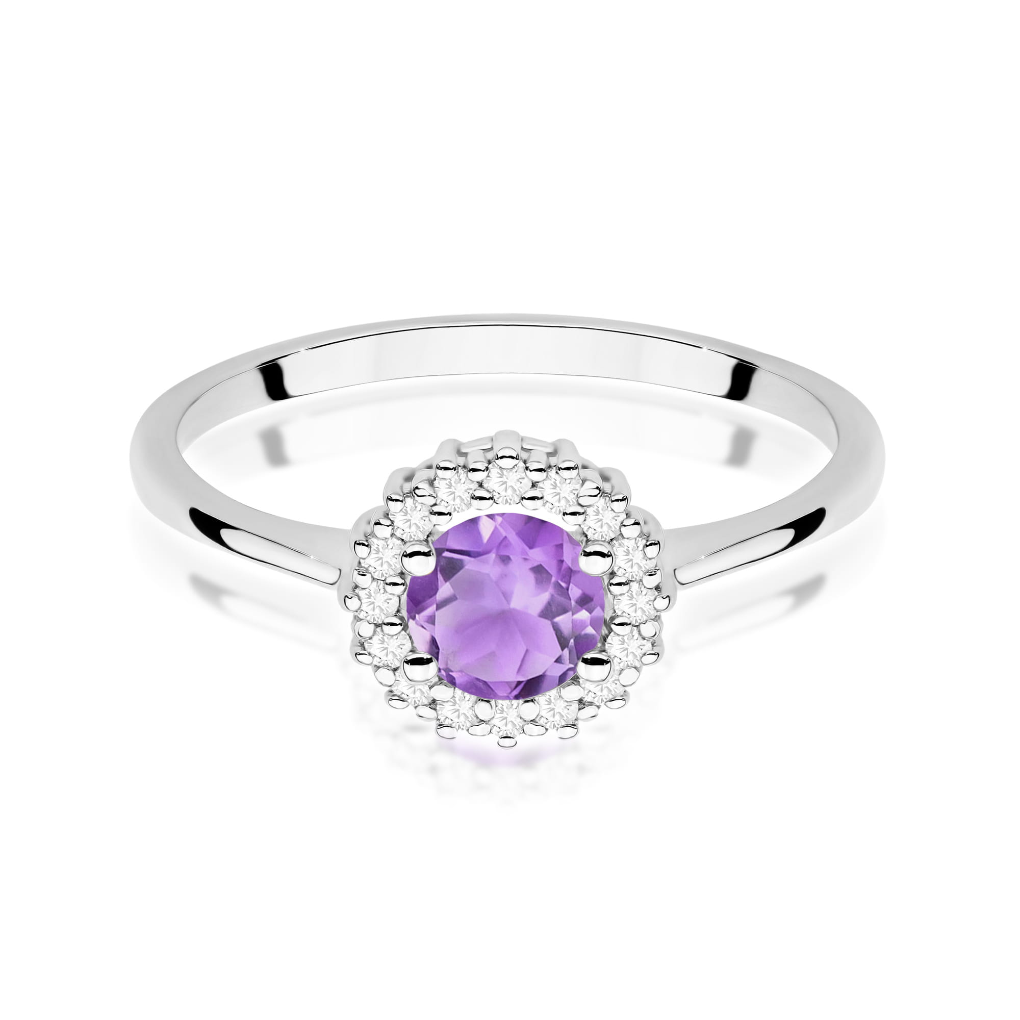 Pierścionek z ametystem 0,50 ct i 16 diamentami 0,14 ct w białym złocie 585. Klasyczna oprawa halo z kamieniem kolorowym.
