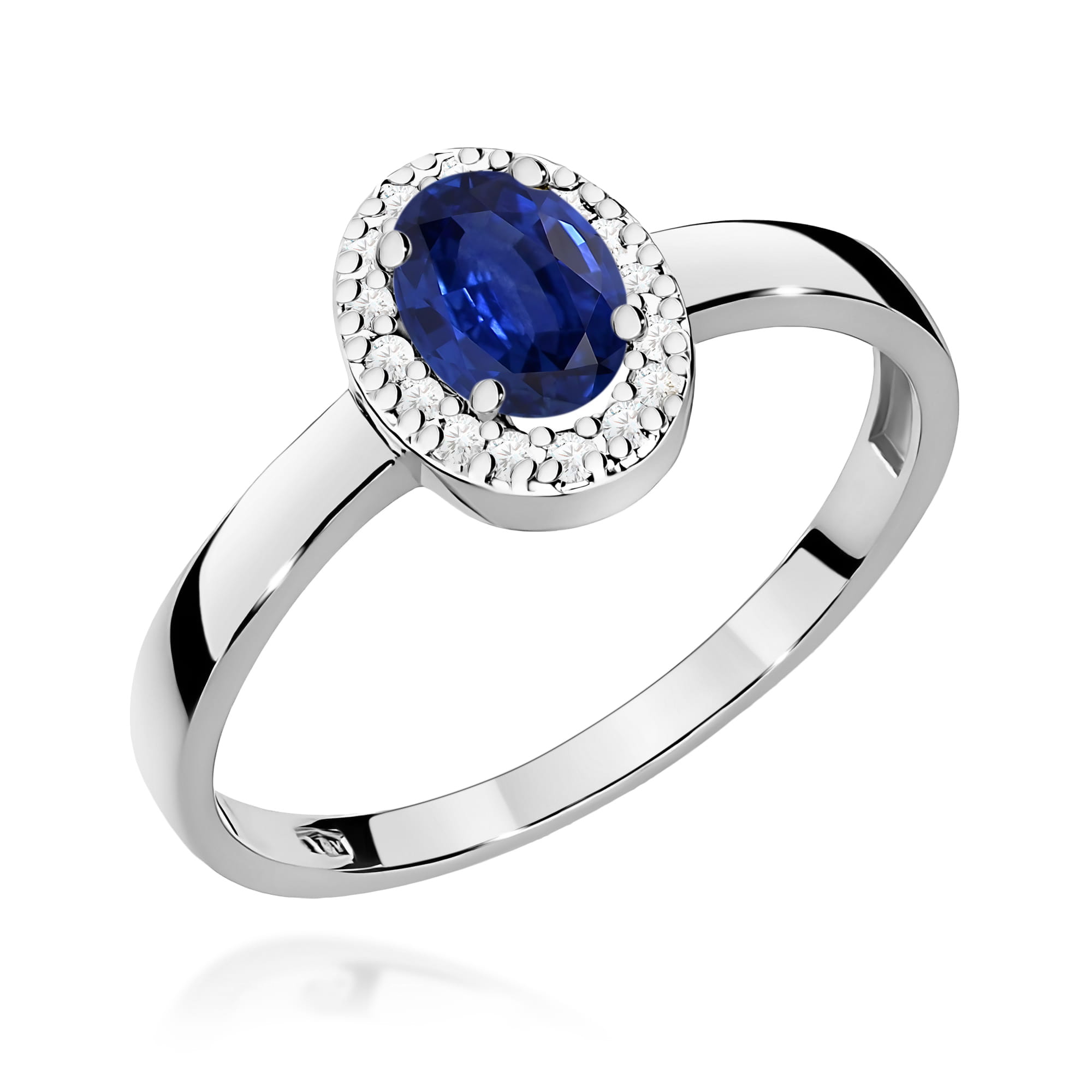 Centralny szafir o masie 0,70 ct ma owalny szlif oraz wymiary 6 × 4 mm. Kamień zachwyca głęboką, niebieską barwą i pięknie odbija światło.