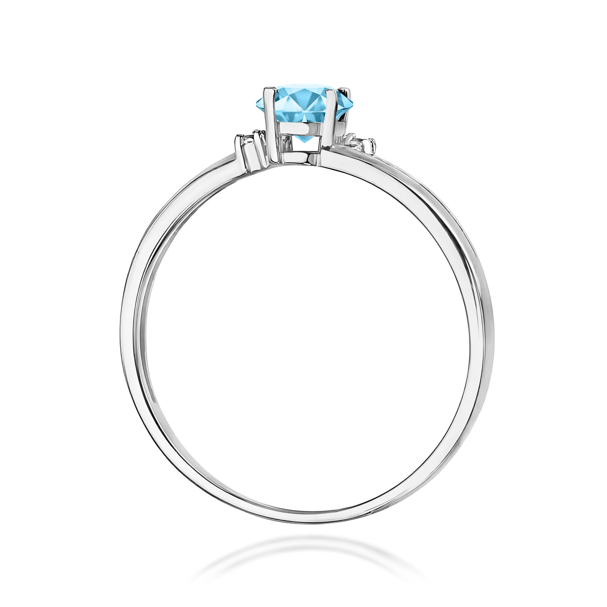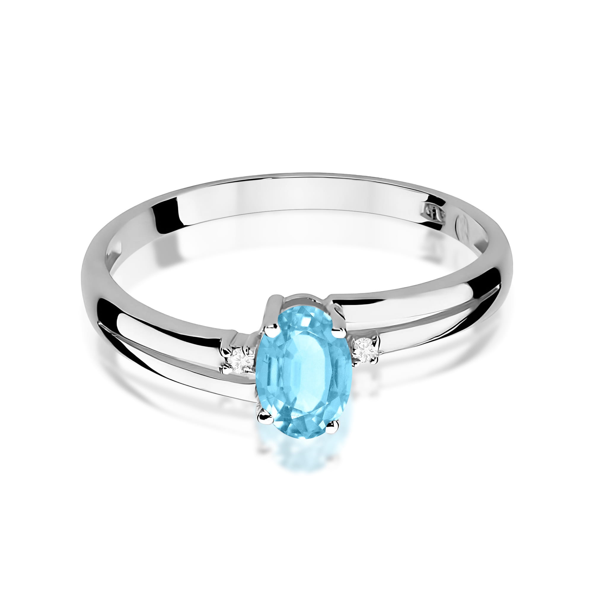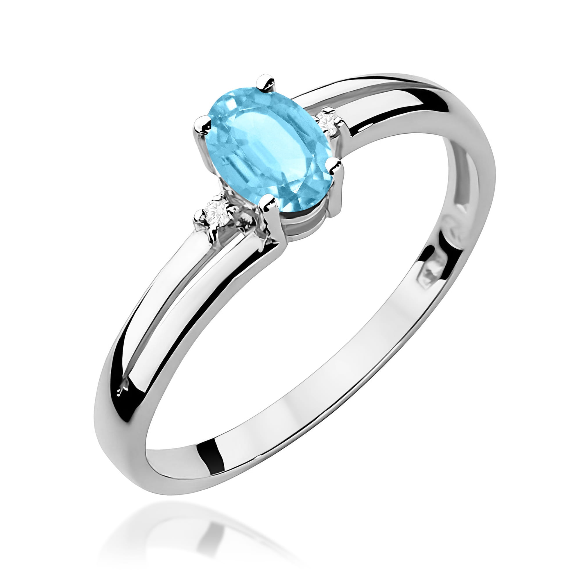 Elegancki pierścionek z topazem Swiss Blue i diamentami wykonano z wysokiej jakości białego złota próby 585. Jasny odcień metalu pięknie podkreśla kolor kamieni, dlatego biżuteria prezentuje się niezwykle stylowo i ponadczasowo.
