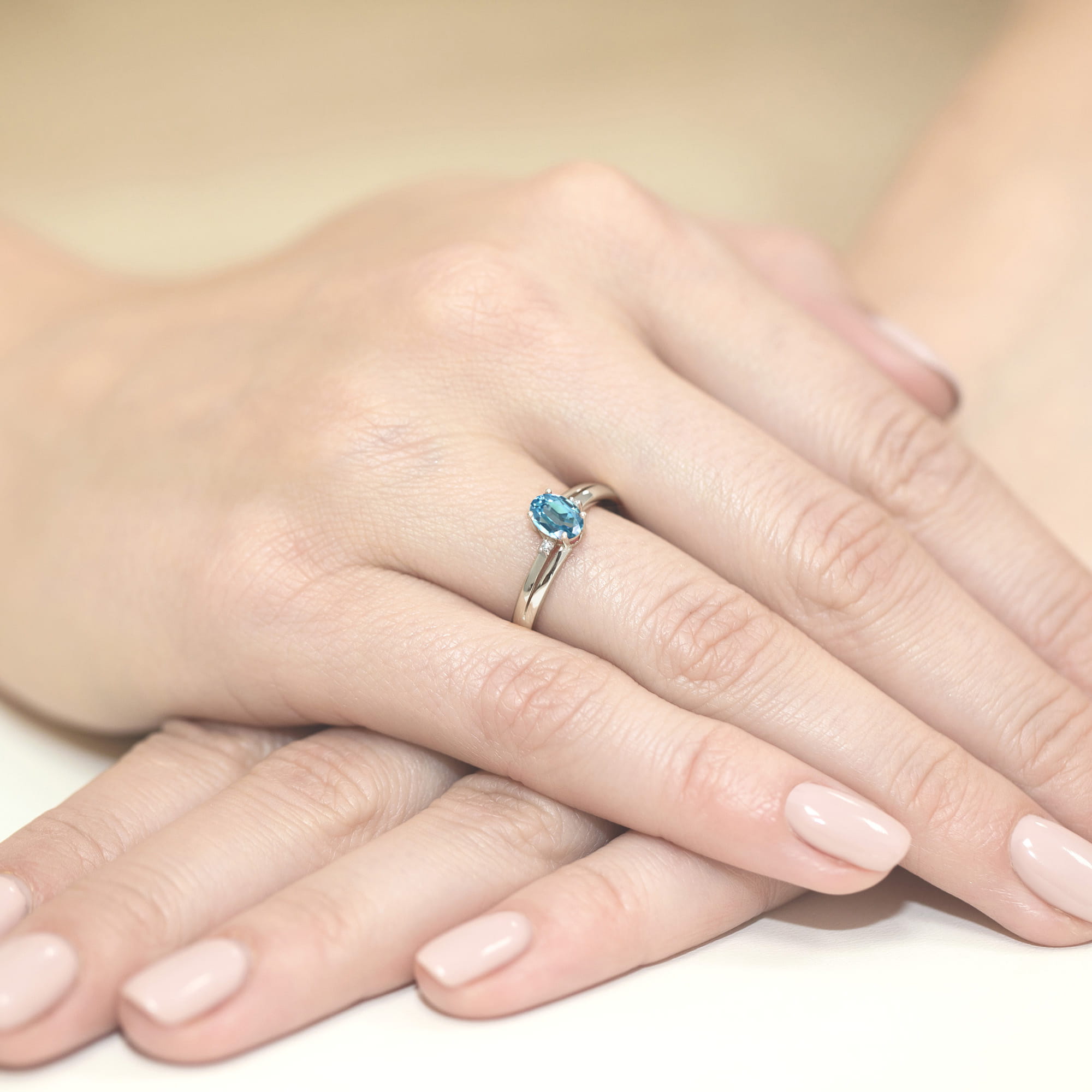 Centralne miejsce zajmuje topaz Swiss Blue o masie 0,50 ct. Kamień ma owalny szlif oraz wymiary 6 × 4 mm, dzięki czemu efektownie odbija światło. Intensywna, błękitna barwa topazu przyciąga uwagę i nadaje pierścionkowi wyjątkowej elegancji.