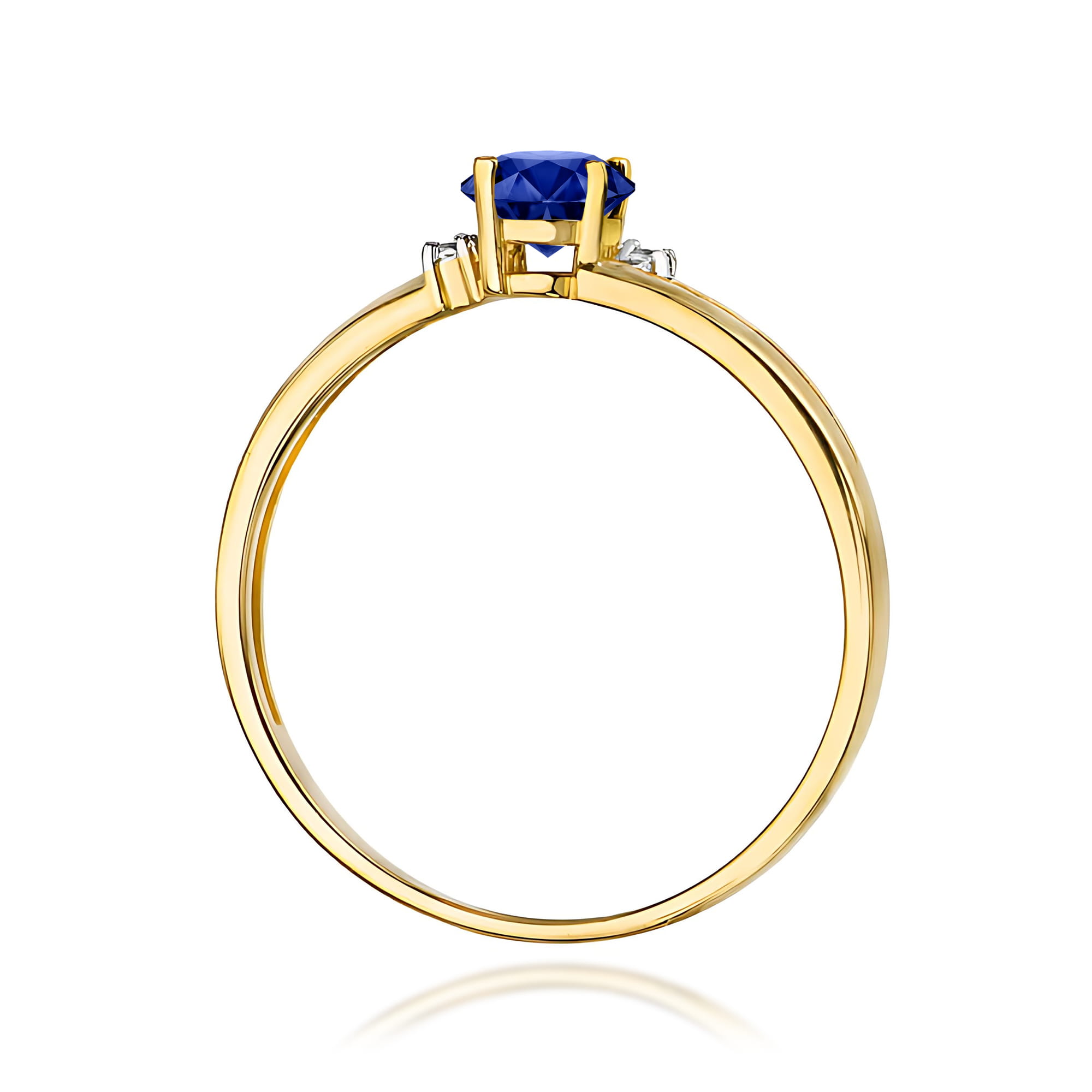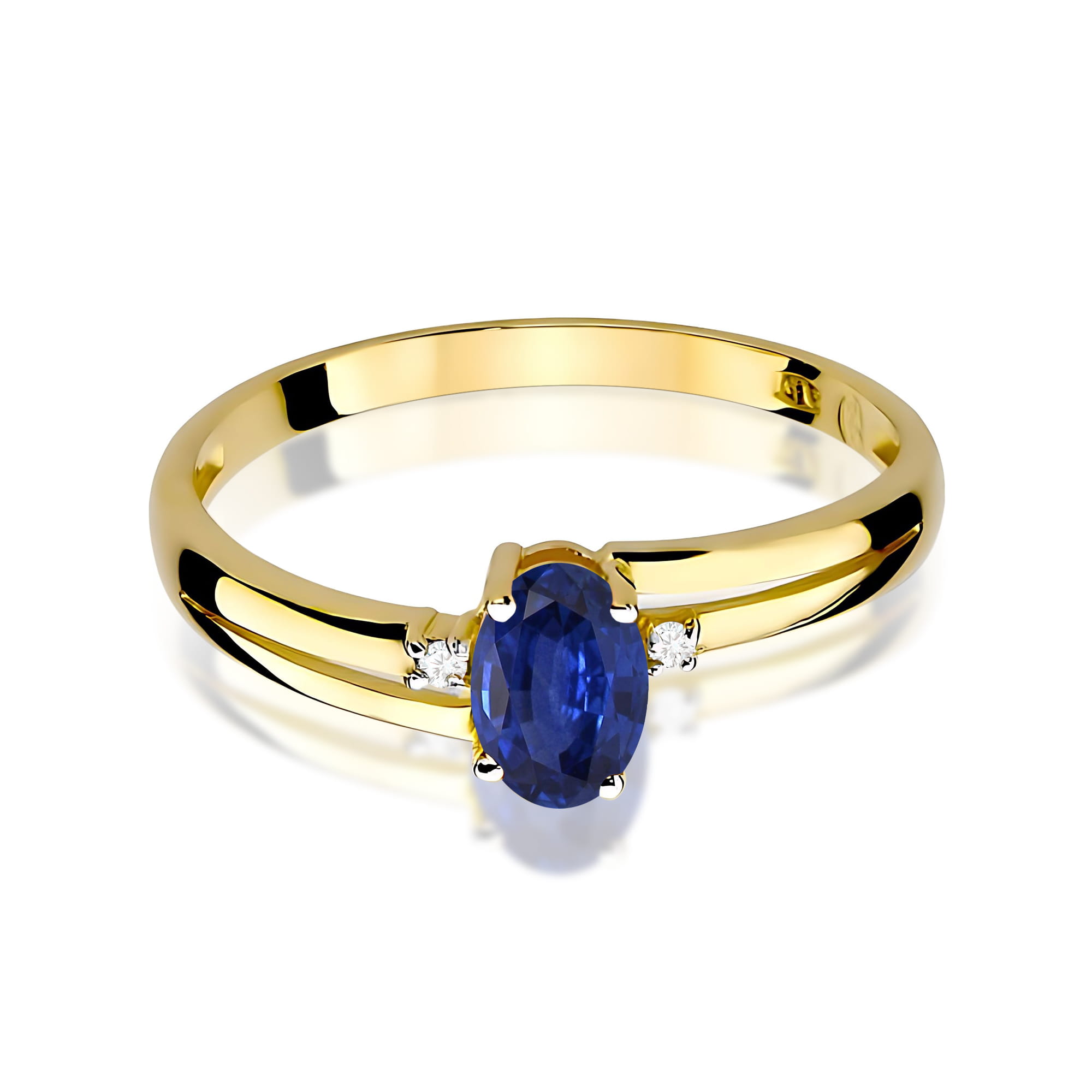 Stylowy pierścionek z szafirem i diamentami wykonano z wysokiej jakości żółtego złota próby 585. Ciepły odcień metalu pięknie kontrastuje z głęboką barwą kamieni, dlatego biżuteria prezentuje się elegancko i ponadczasowo.
