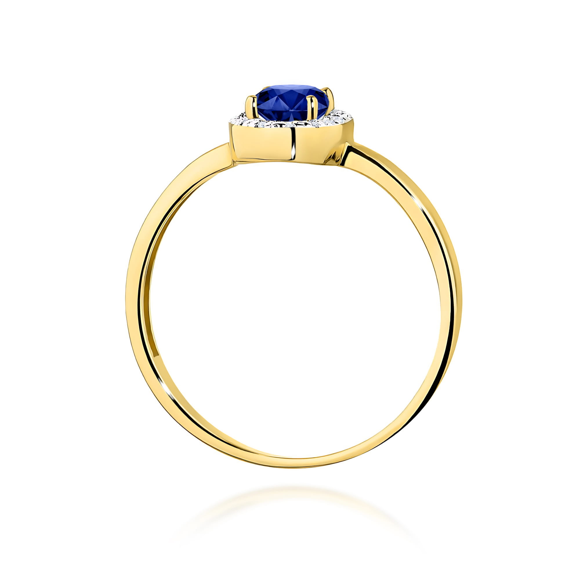 Elegancki pierścionek z szafirem i diamentami wykonano z wysokiej jakości żółtego złota próby 585. Klasyczny design i intensywna barwa kamienia sprawiają, że biżuteria prezentuje się niezwykle szlachetnie.