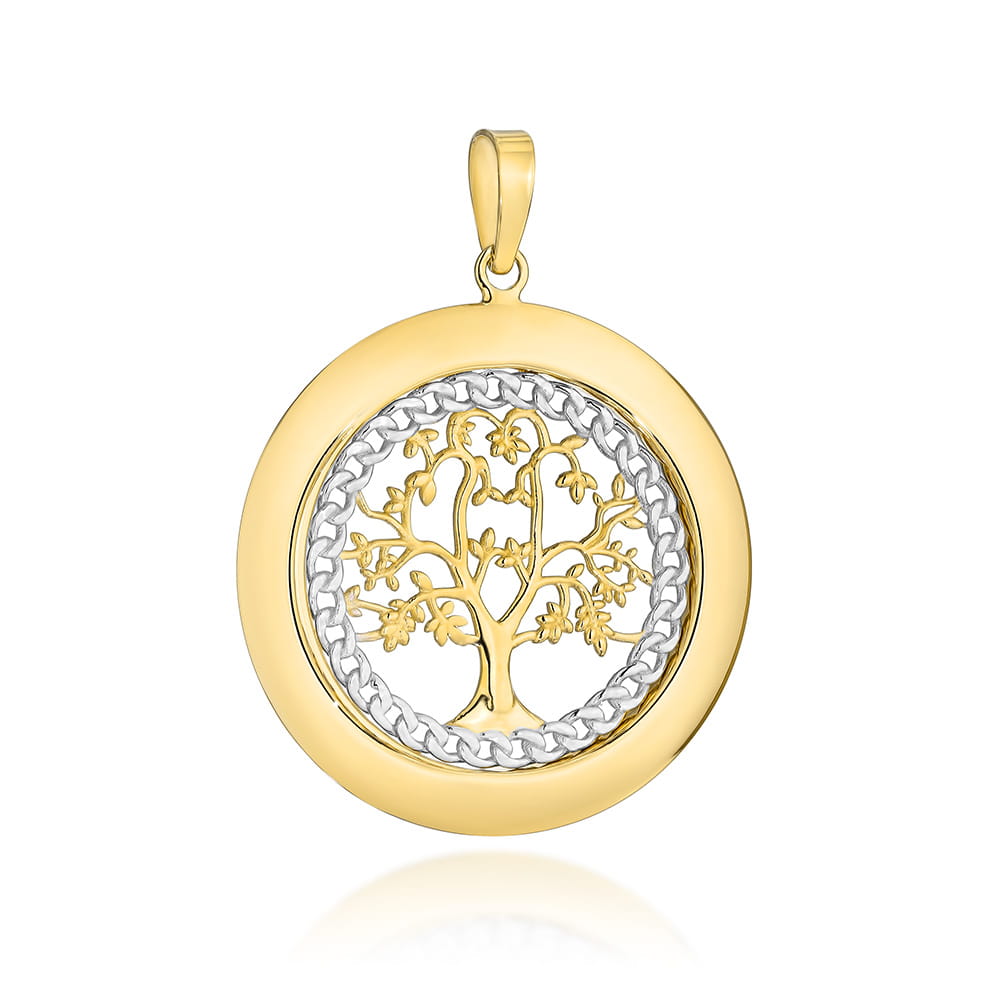 Zawieszka złota drzewko szczęścia w kole w dwóch kolorach złota próby 585. Średnica 25,60 mm i efektowny, symboliczny wzór.