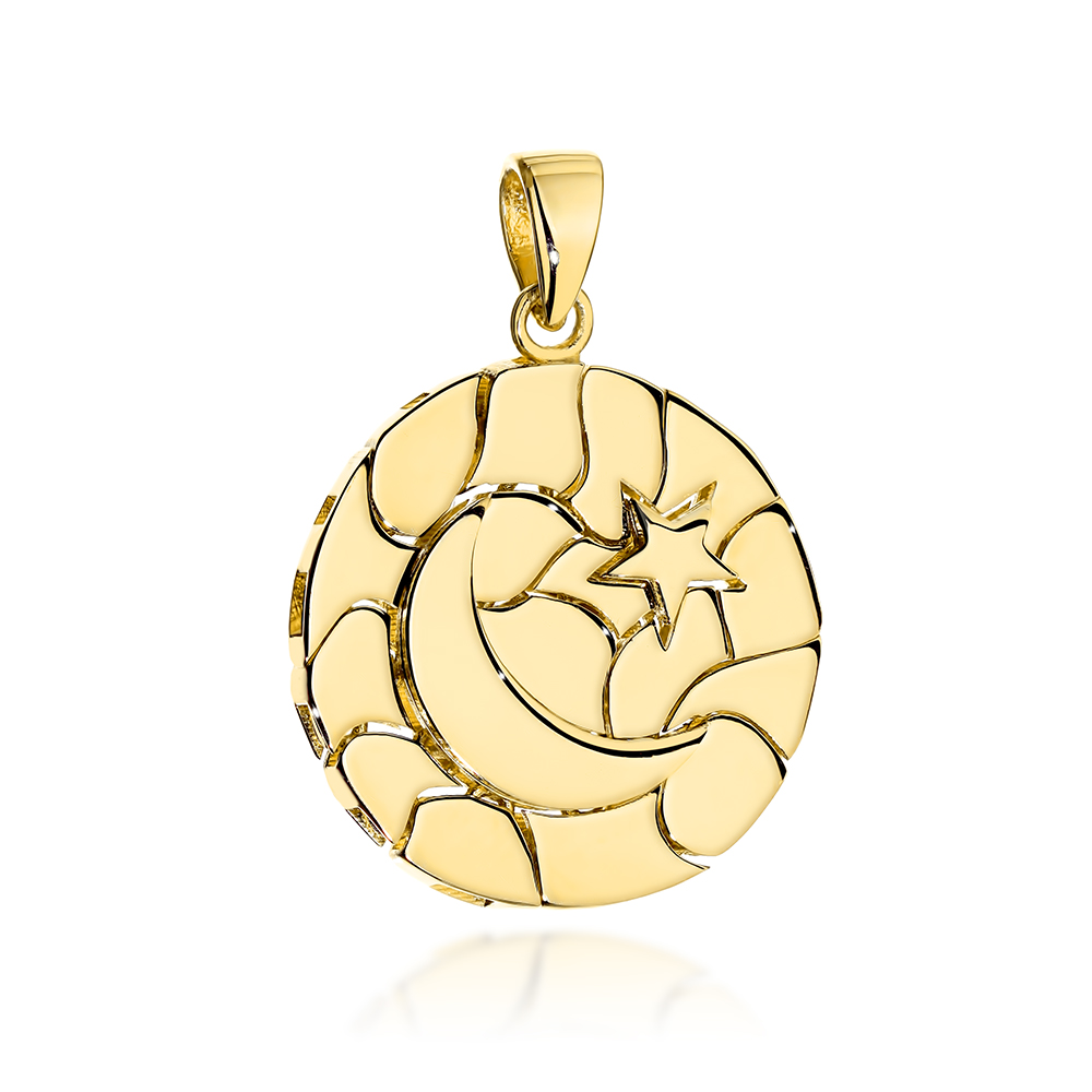 Złota zawieszka ruchoma księżyc i gwiazdka to uroczy i symboliczny dodatek o wyjątkowym charakterze. Wykonana z żółtego złota próby 585, ma okrągły kształt, wewnątrz którego swobodnie poruszają się księżyc i gwiazdka, tworząc delikatny i magiczny efekt.