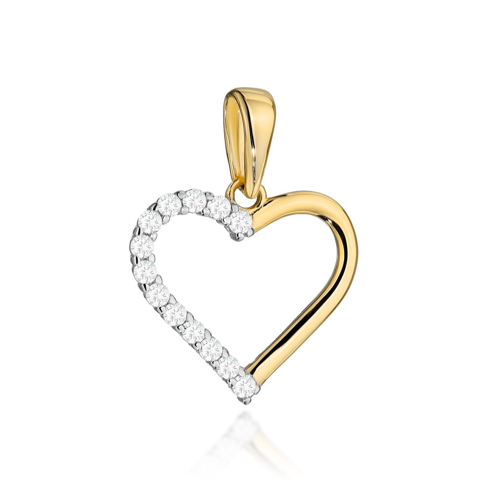 Zawieszka złota serce wysadzane cyrkoniami to romantyczna i elegancka biżuteria. Powstała z żółtego złota próby 585, które łączy trwałość i ponadczasowy blask. Subtelny kształt serca o wymiarach 13 × 12 mm zdobią lśniące cyrkonie o średnicy 1 mm, dodając zawieszce wyjątkowego uroku. Całkowita wysokość z uchwytem wynosi 17 mm, dzięki czemu zawieszka prezentuje się delikatnie i efektownie na łańcuszku. To doskonały wybór jako symbol miłości i piękny prezent.