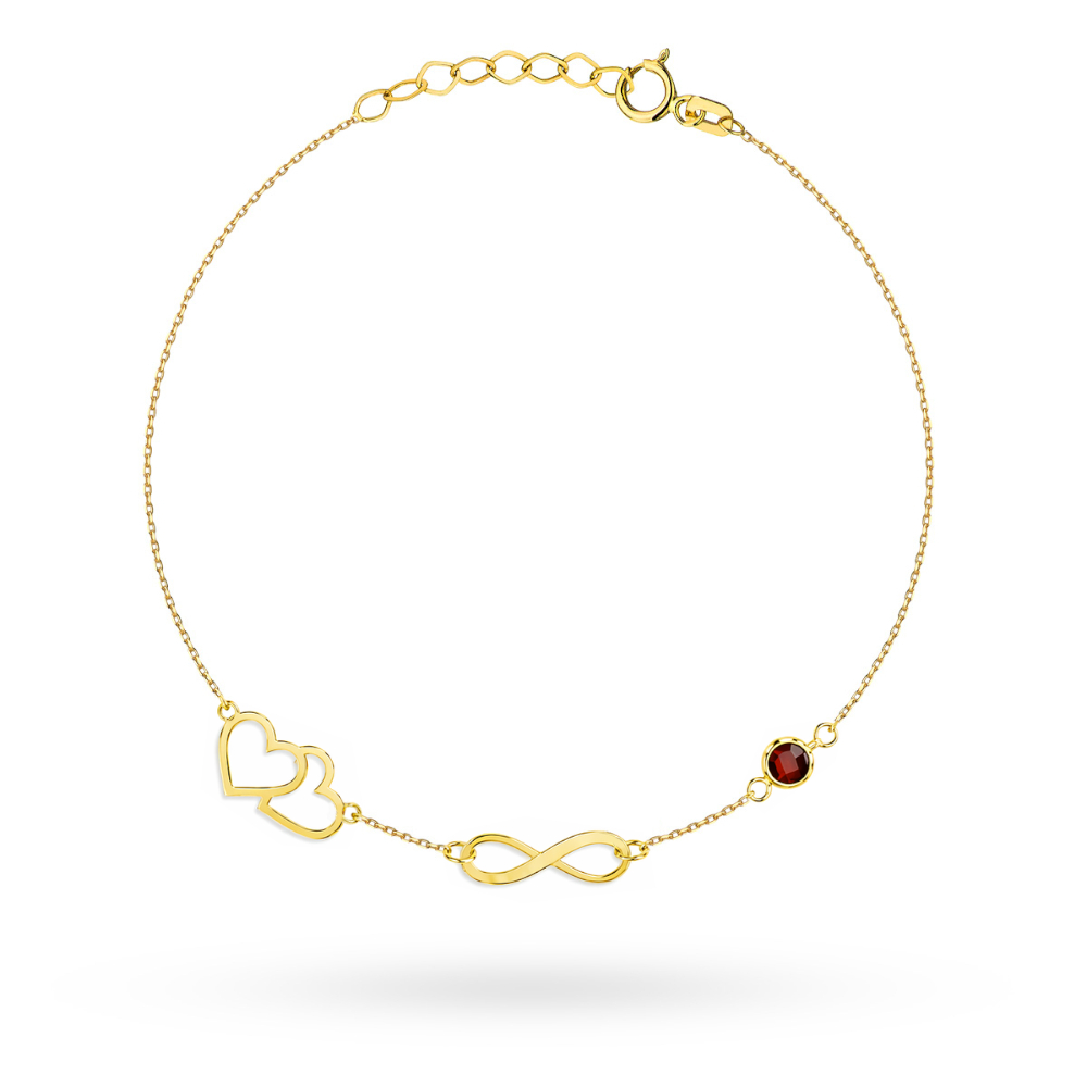 Złota bransoletka serca, nieskończoność i kamień w kolorze rubinowym