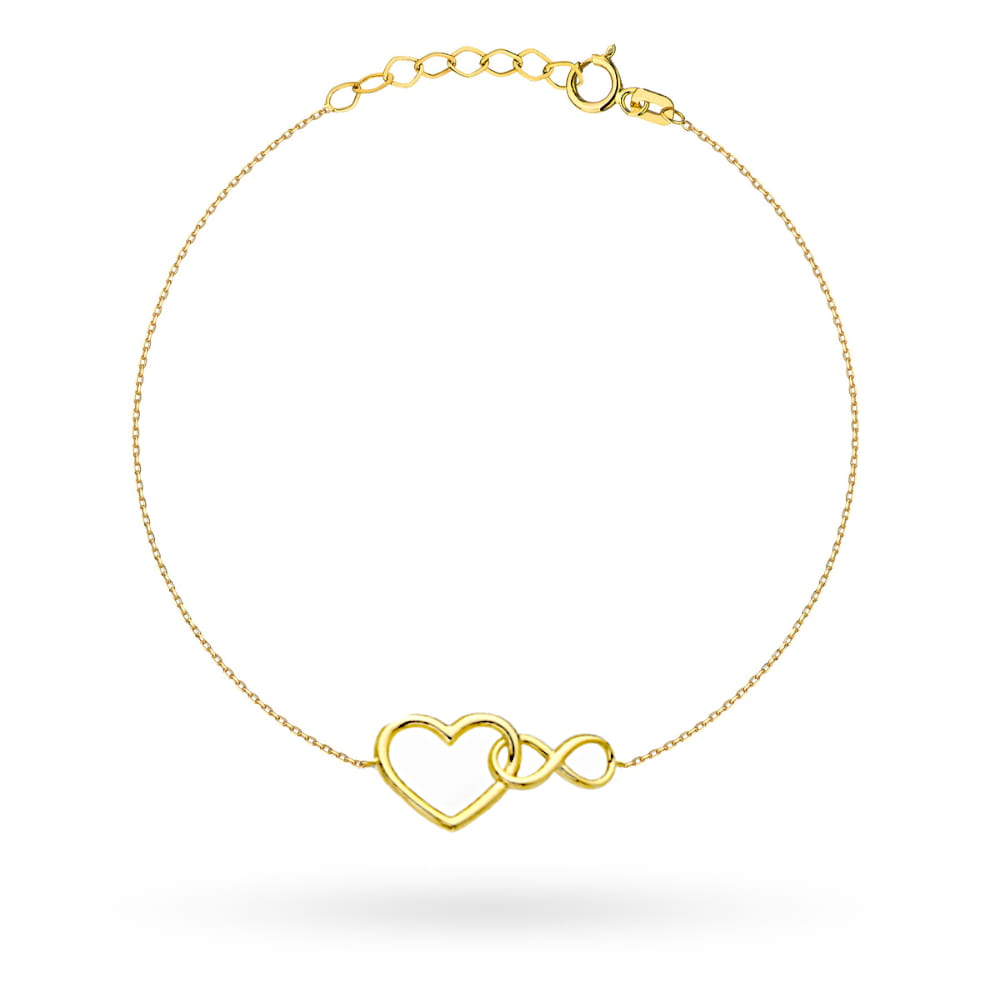 Rodzaj Pełny Długość [cm] 17,5 + 2 (regulacja długości) Kamień Bez kamienia Wzór Serce / Nieskończoność Materiał Złoto Próba złota 585 Kolor złota Żółty Szerokość serduszka [mm] 8 Długość serduszka [mm] 6 Szerokość nieskończoności [mm] 8 Długość nieskończoności [mm] 3