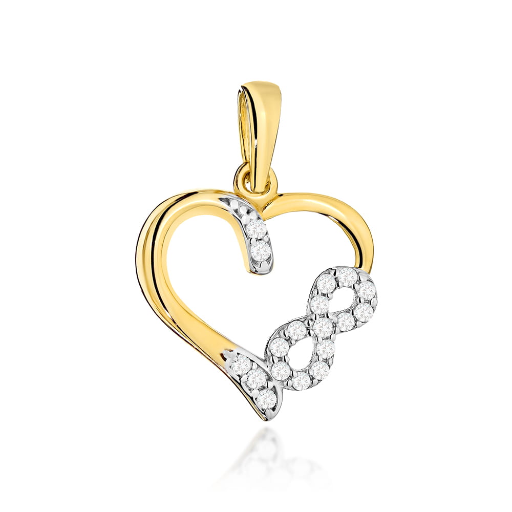 Złota zawieszka serce ze znakiem nieskończoności z cyrkoniami, dwa kolory złota, próba 585. Symbol miłości i elegancji.
