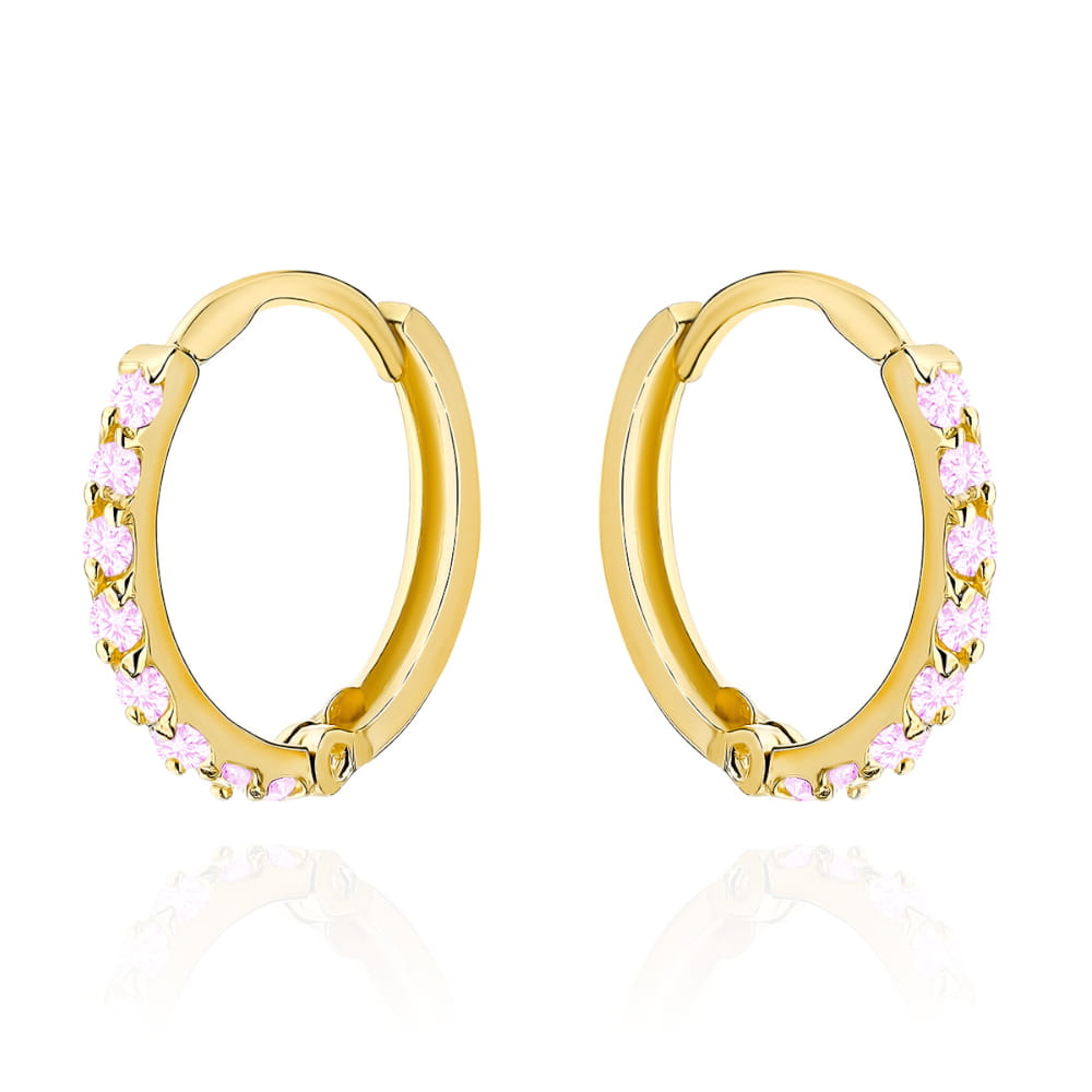 Złote kolczyki kółka z różowymi kamieniami z żółtego złota próby 585. Subtelny kolor, klasyczna forma i elegancki styl.