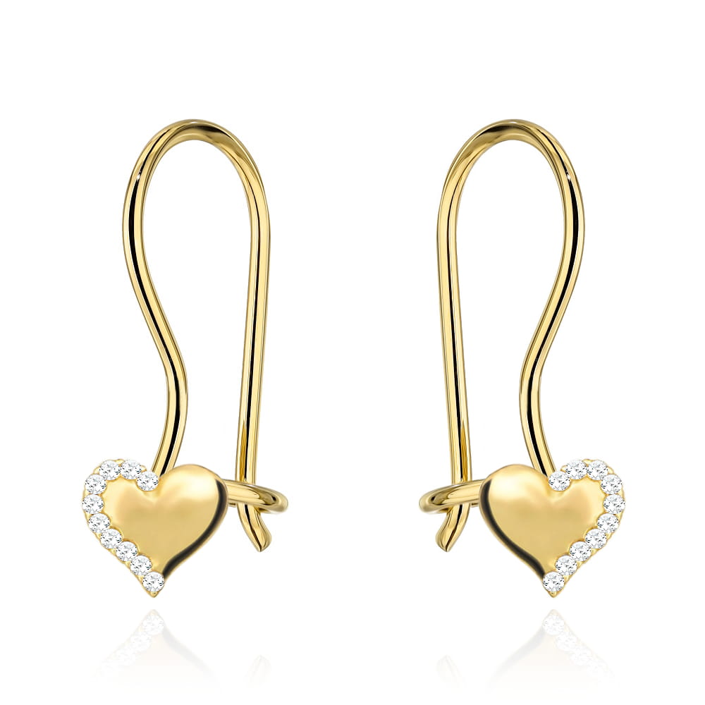 💛 Złote kolczyki serca z cyrkoniami na biglu – żółte złoto próby 585