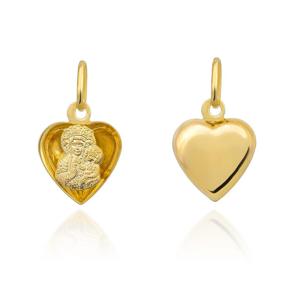Subtelny złoty medalik wykonany z żółtego złota próby 585 przedstawiający Matkę Boską Częstochowską z dzieciątkiem w formie serca to wyjątkowa biżuteria o głębokim znaczeniu duchowym i symbolicznym. Delikatny kształt serduszka nadaje całości wyjątkowej lekkości oraz podkreśla emocjonalny charakter zawieszki.