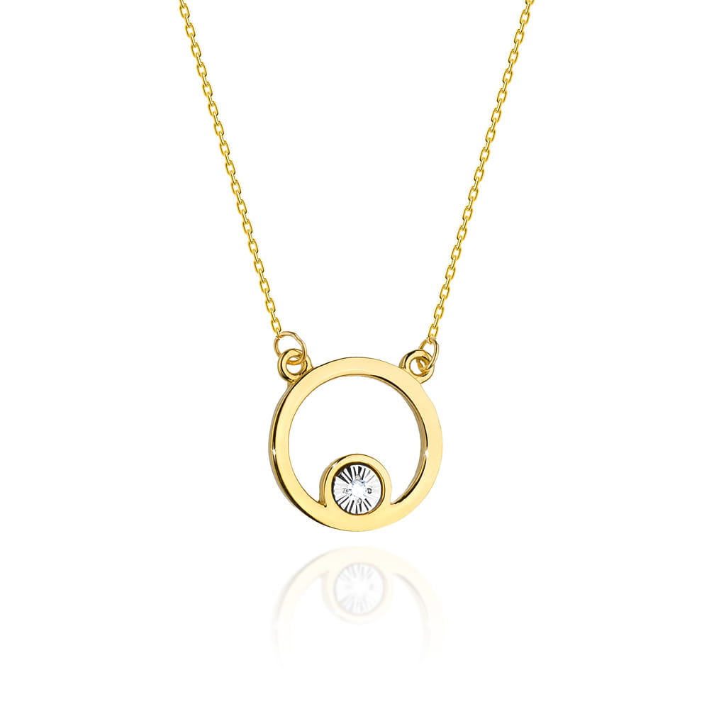Klasyczny i subtelny złoty naszyjnik z diamentem wykonany z żółtego złota próby 585 to elegancka biżuteria idealna na każdą okazję. W centrum zawieszki znajduje się pojedynczy diament o masie 0.01 ct, barwie H i czystości SI2, który dodaje całości delikatnego, szlachetnego blasku. Regulowana długość łańcuszka od 42 do 45 cm sprawia, że naszyjnik doskonale układa się na dekolcie i pasuje zarówno do codziennych, jak i bardziej formalnych stylizacji. Całość waży od 1.4 do 1.8 g, co zapewnia komfort noszenia i wysoką jakość wykonania.